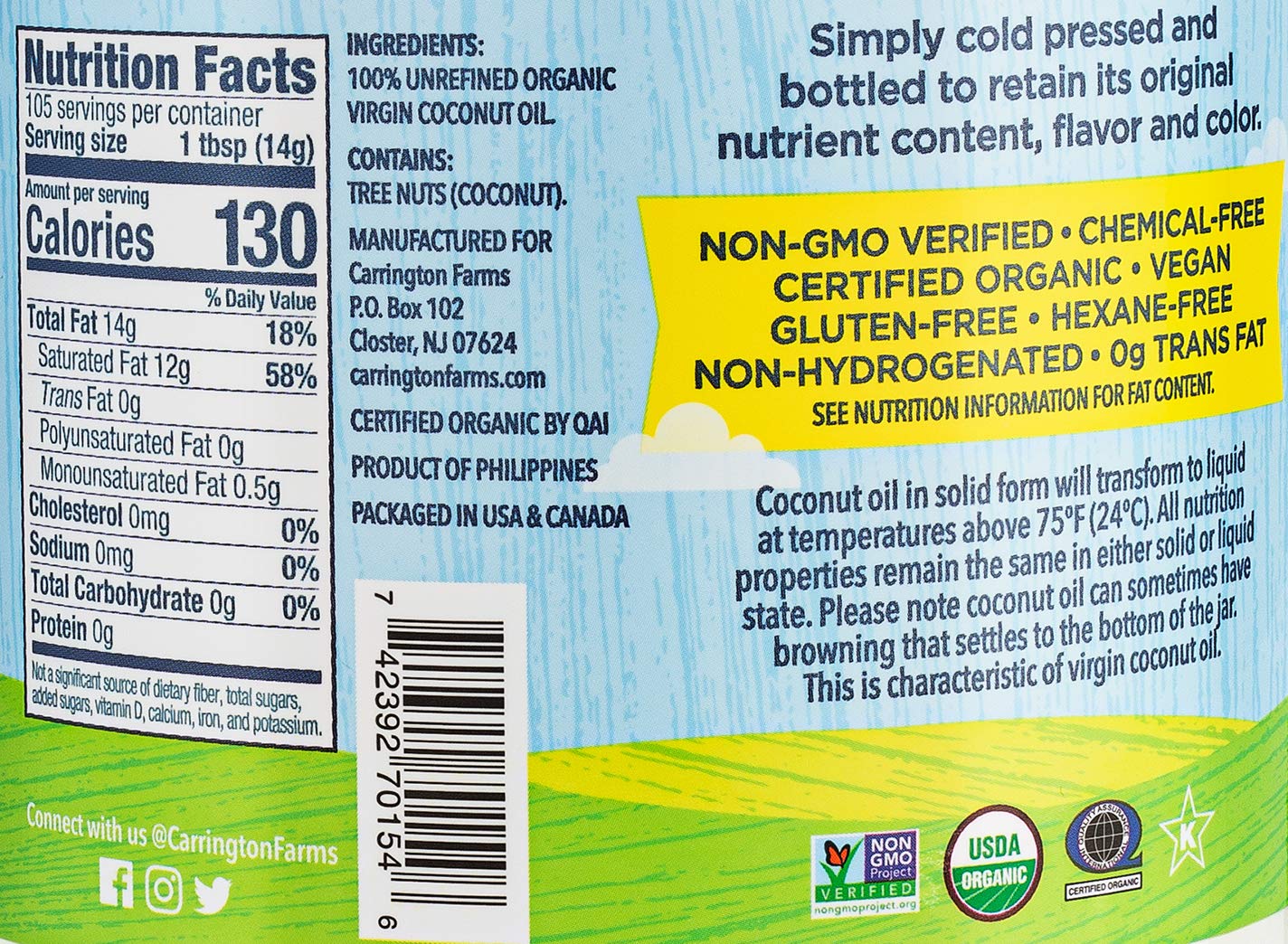 Carrington farms unrefined organic coconut oil is simply pressed and bottled so it retains it's original nutrient content, flavor, and color. We especially enjoy the fact that the oil can be added to food subtly and not take away from the natural flavors of any dish. This is a very good product. Carrington farms coconut cooking oil is simply pressed and bottled, retaining its original nutritional content and color. It can also be an excellent substitute for treating various skin conditions, such as rashes, eczema, sunburn, and insect bites. Perfect for hair and skin. Carrington farms gluten free, unrefined, cold pressed, virgin organic coconut oil, 8 packets (pack of 6), coconut oil for skin & hair care, cooking, & smoothies: Liquid coconut cooking oil is a great alternative to traditional oils such as vegetable, olive, canola, and corn oil. You can use coconut oil to give your hair the shine it deserves and get it back on track. Carrington farms gluten free, unrefined, cold pressed, virgin organic coconut oil, 25 oz. Get carrington farms coconut oil, organic, virgin unrefined (25 oz) delivered to you within two hours via instacart. Great in baked goods and over popcorn! Carrington farms 16 fl oz & 32 fl oz organic liquid coconut cooking oil is the perfect cooking and baking ingredient swap!